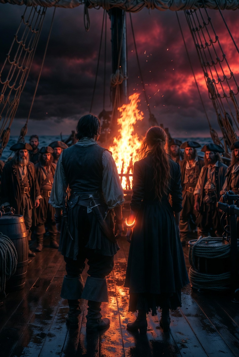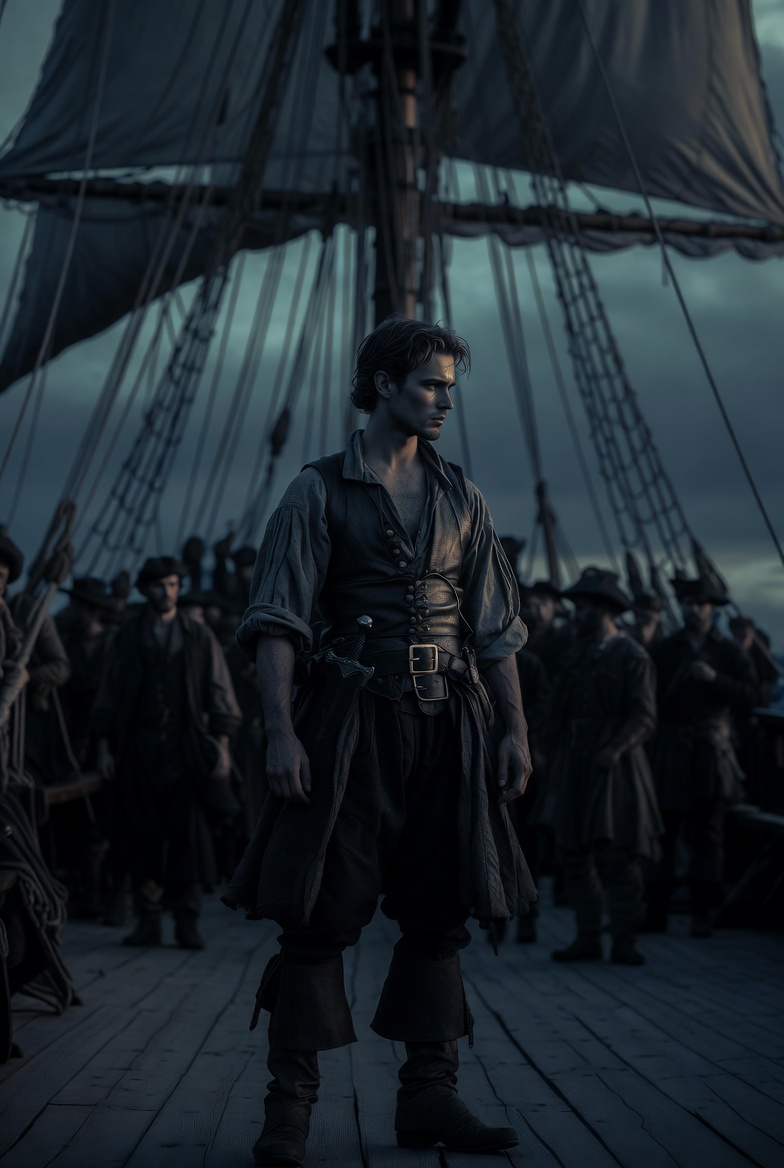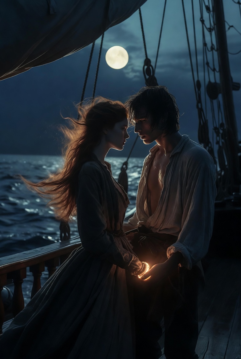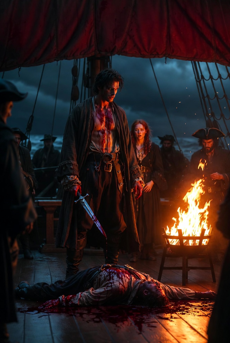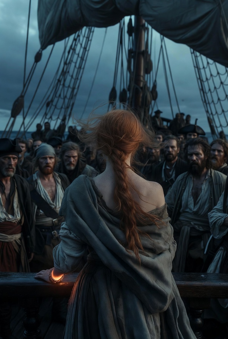 She was hauled upward in a brutal pull. Her body hit the soaked planks before collapsing onto the deck. Around her, silhouettes ran, pulling ropes, shouting into the wind. The sea tossed the vessel like it wanted to break it apart.
