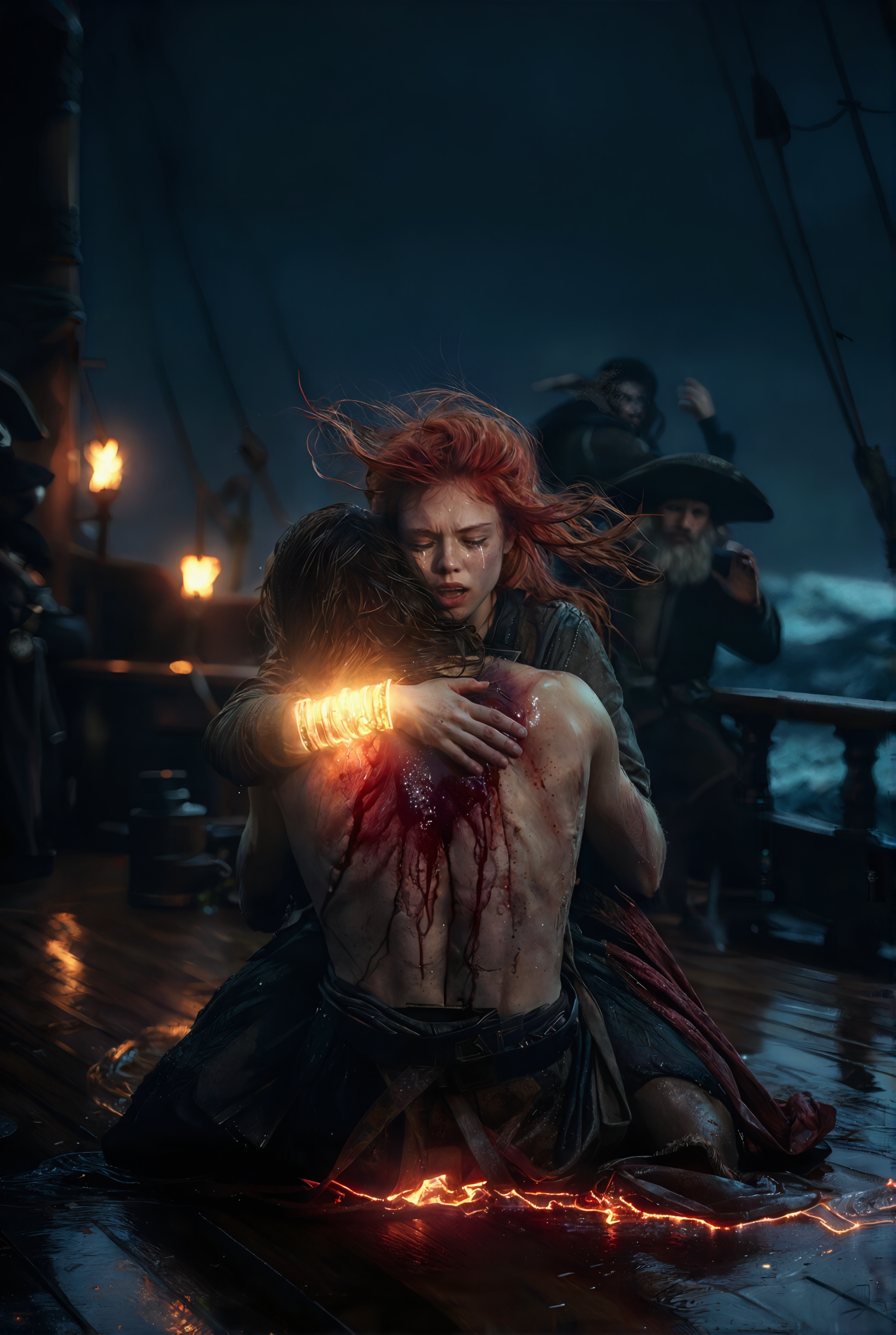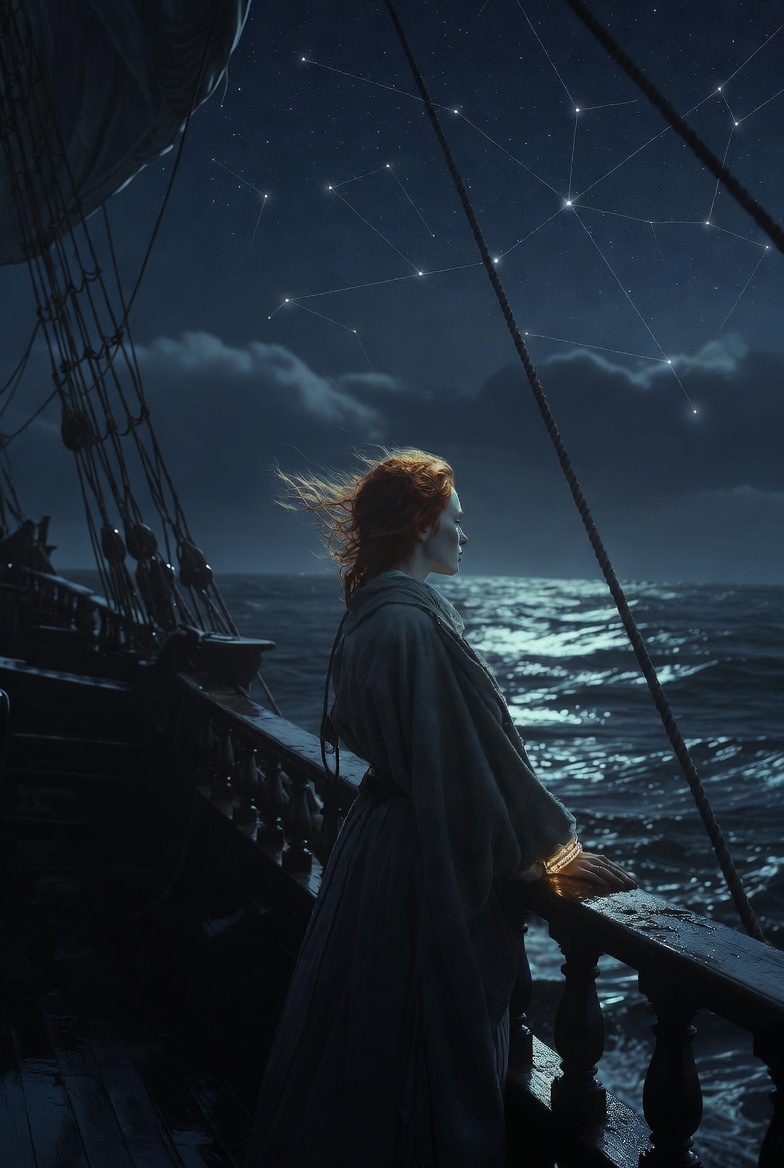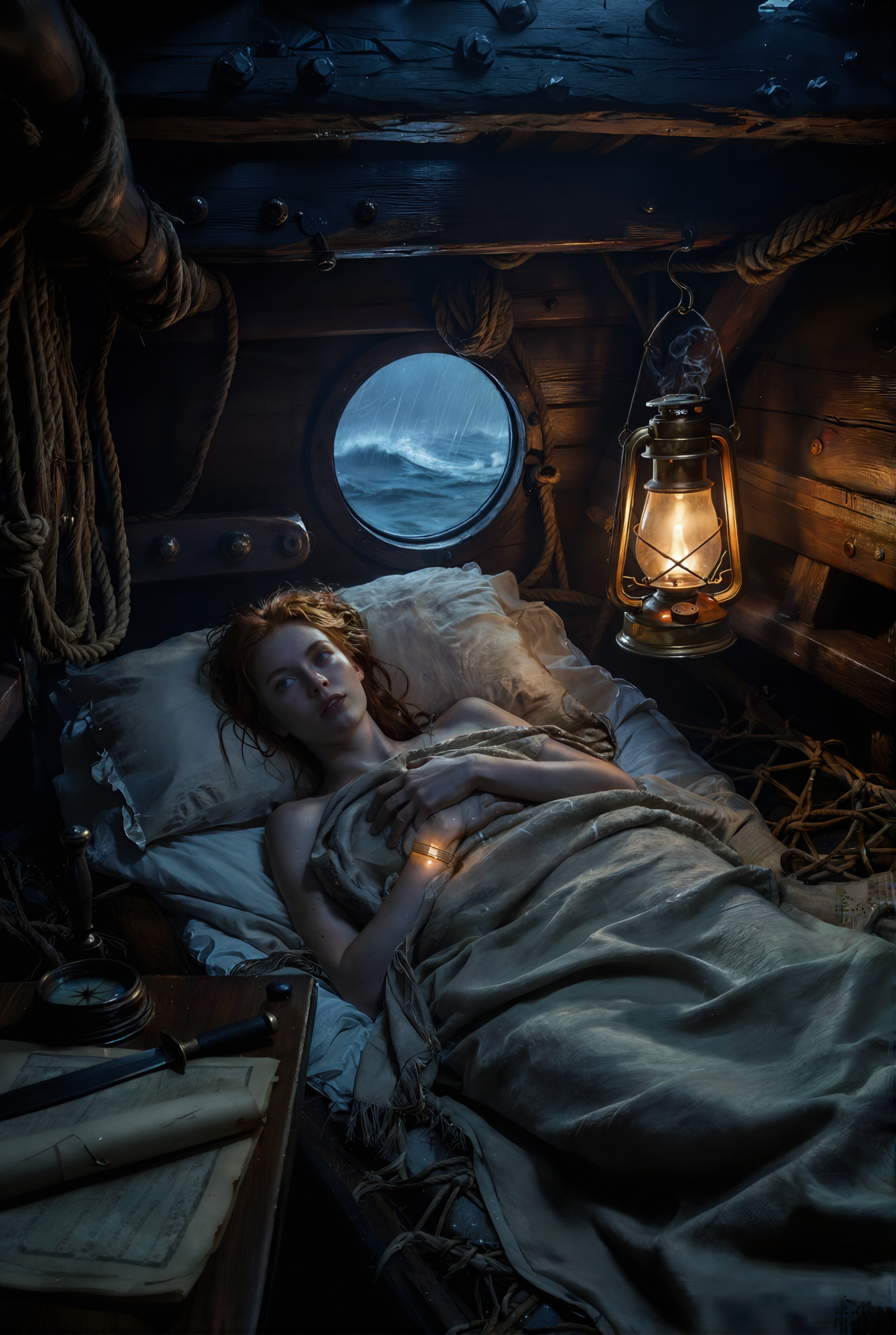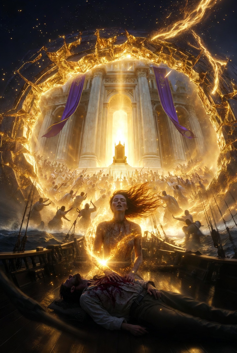 She was hauled upward in a brutal pull. Her body hit the soaked planks before collapsing onto the deck. Around her, silhouettes ran, pulling ropes, shouting into the wind. The sea tossed the vessel like it wanted to break it apart.