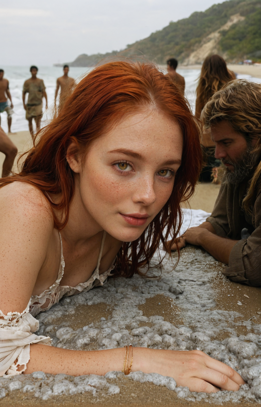 La mer s’était calmée, Naya demeurait étendue sur le sable chaud, frêle épave rejetée par les flots. Ses cheveux roux, emmêlés d’écume et de sable, s’étalaient autour de son visage pâle. Sa peau, blanche comme une statue de marbre, semblait presque irréelle sous la lumière crue du matin. A son poignet, un bracelet d’or brillait faiblement. Epuisée, elle ferma les yeux.